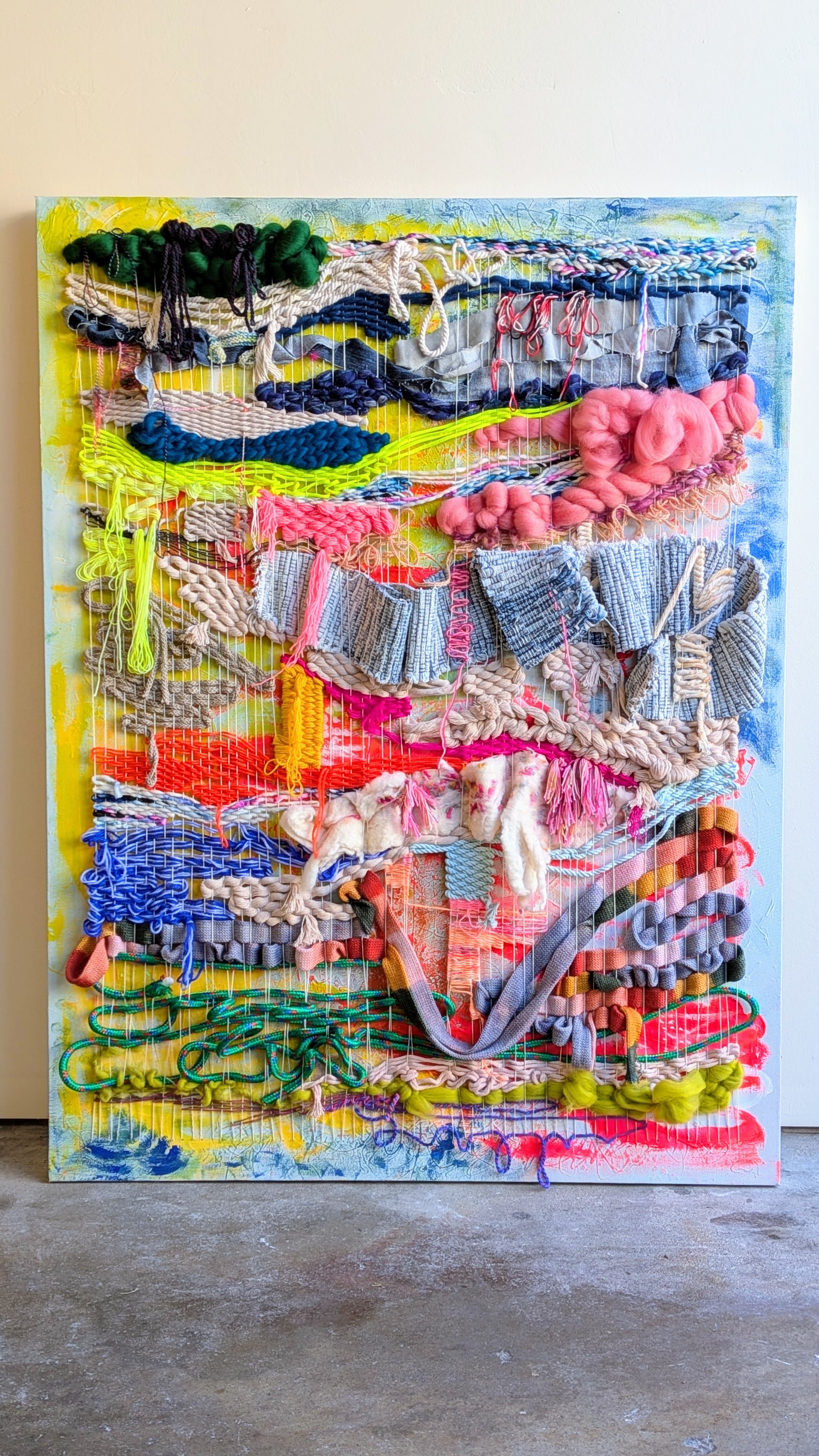 Cotton string, yarn, wool, recycled rug scraps, rope, painted canvas.